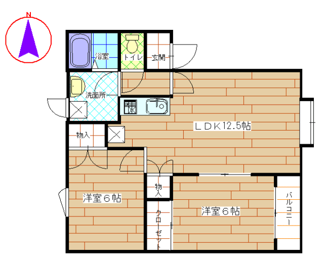 | 間取り | 洋室6帖×二、LDK12.5帖、物置 | |||