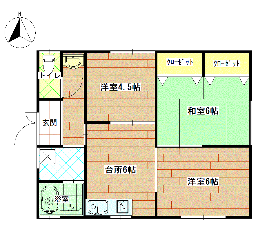 | 間取り | 洋室6帖、和室6帖、洋室4.5帖、台所6帖 | |||