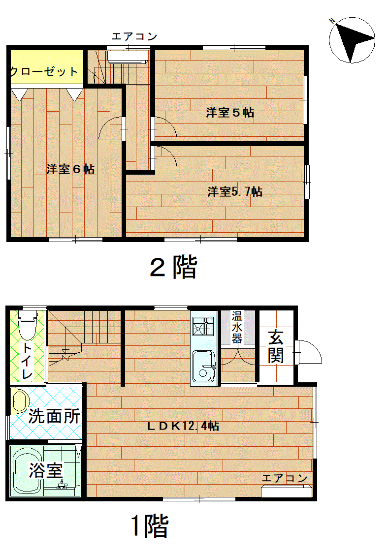 | 間取り | 1F)LDK12.4帖 2F)洋室6帖、洋室5.7帖、洋室5帖 |